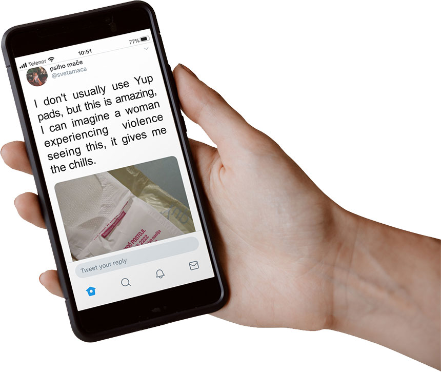 The helpline number, along with the message ”There is a way out”, was printed inside all sanitary pad brands produced by Drenik ND Company: Boni, Feel Fine and Yup.